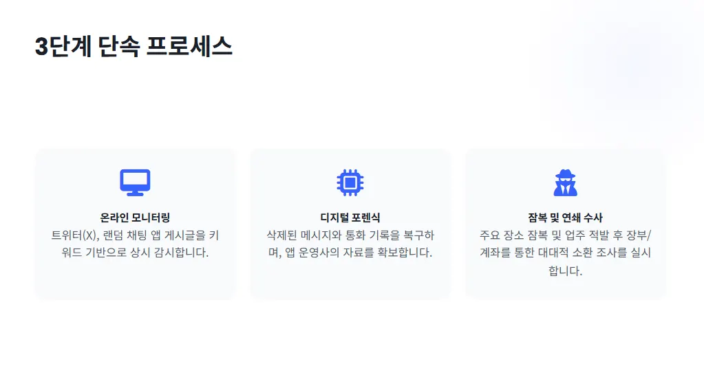 수사는 대부분 온라인에서 시작됩니다. 트위터(엑스 X)나 각종 채팅 앱에 올라오는 게시글과 대화를 경찰이 키워드 기반으로 상시 모니터링하고 있습니다. 출시된 지 얼마 안 된 만남 어플도 수사망에 오르는 경우가 있습니다.