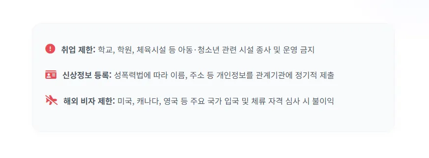 또한 해외 입국과 체류 자격에도 영향이 미칩니다. 성범죄 이력이 있으면 여러 나라에서 비자 심사를 통과하지 못할 수 있습니다. 미국, 캐나다, 호주, 영국은 성범죄 전과에 대한 심사가 특히 엄격합니다.