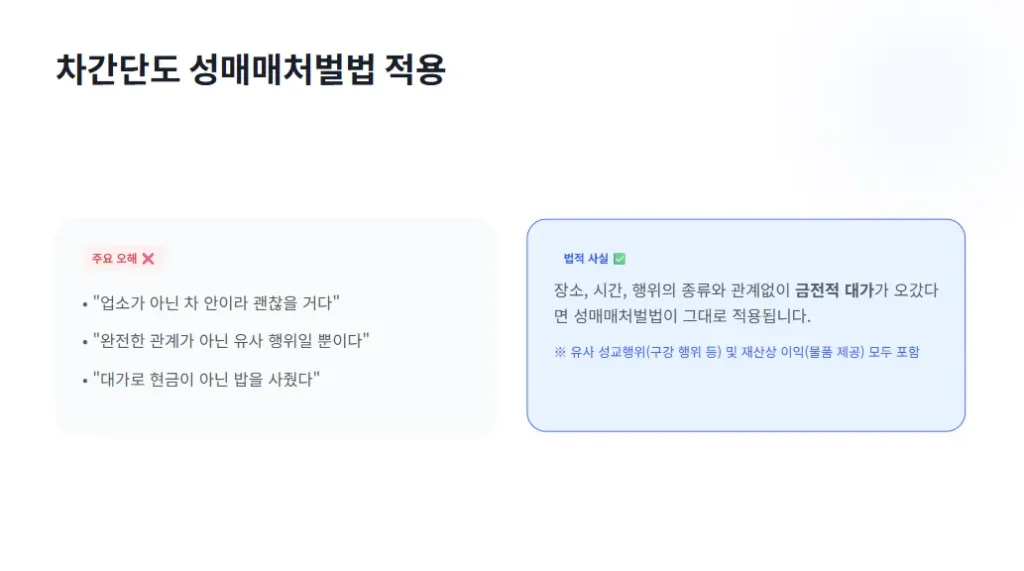 차 안에서 이루어졌어도 금전 대가가 오간 성행위·유사 성교행위라면 성매매처벌법이 그대로 적용됩니다.