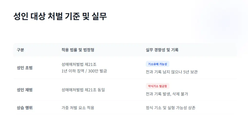 성인 상대 초범성매매처벌법 제21조징역 1년 / 벌금 300만 원 이하기소유예 가능성 있음