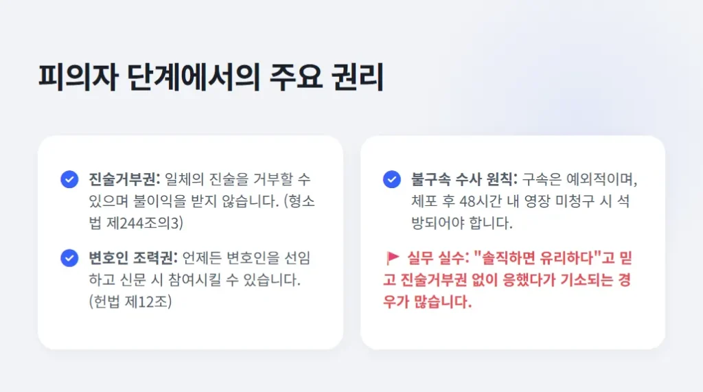 피의자는 수사기관의 조사를 받는 단계이지만, 헌법과 형사소송법은 다음 권리들을 보장하고 있습니다.